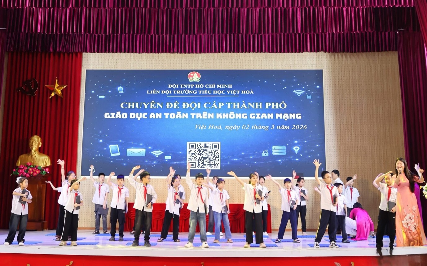 Sáng 02/3, Liên đội Trường Tiểu học Việt Hòa tổ chức chuyên đề Đội cấp thành phố với chủ đề “Giáo dục an toàn trên không gian mạng” – “Một chạm thông minh – An toàn trên không gian mạng”. Chương trình phối hợp cùng Trung tâm Kỹ năng sống Vietsun, hướng tới mục tiêu trang bị kỹ năng số an toàn cho học sinh tiểu học.